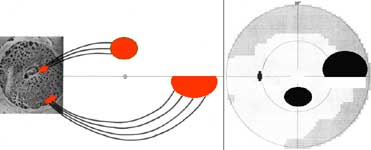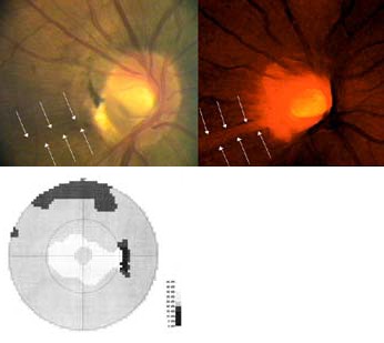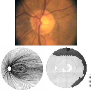 K reflexům můžeme přirovnat změny zorného pole a k místu poškození nervového systému vrstvu nervových vláken s terčem zrakového nervu. Ale na rozdíl od neurologů, kteří musí vyšetřovat reflexy, které vidí, aby poznali postižení oblasti CNS, kterou nevidí, můžeme postupovat i opačně, neboť vidíme i funkční i anatomické změny současně.