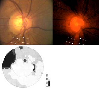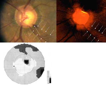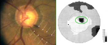Ze změn terče lze pouze usuzovat na změny zorného pole, zatímco defekty ve vrstvě nervových vláken odpovídají změnám zorného pole s velkou přesností, dokonce jim často i předcházejí.