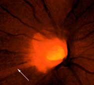 Výpadek nervových vláken začíná temporálně dole, kde je na terči patrný zálom vény. Na barevné fotografii není viditelný, protože se jedná o výpadek v hlubší vrstvě nervových vláken, která je překryta vlákny neporušenými. Tato hluboká vlákna směřují do temporální dolní části makuly a v zorném poli jim odpovídá horní nasální skok.